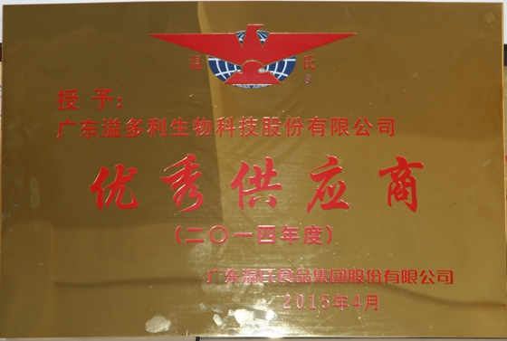 近日,在溫氏集團2014年度優秀供應商大會上,溢多利榮獲“優秀供應商”稱號。